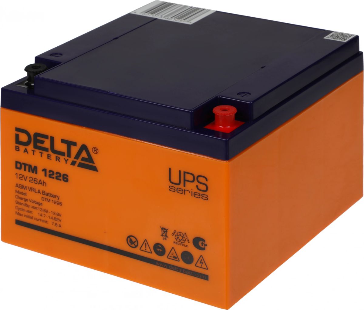 Аккумуляторная батарея Delta DTM 1226. Напряжение 12В, емкость 26Ач. Обладает широким спектром применения. Рекомендуется для использования в буферном и в циклическом режимах. Срок службы 6 лет.