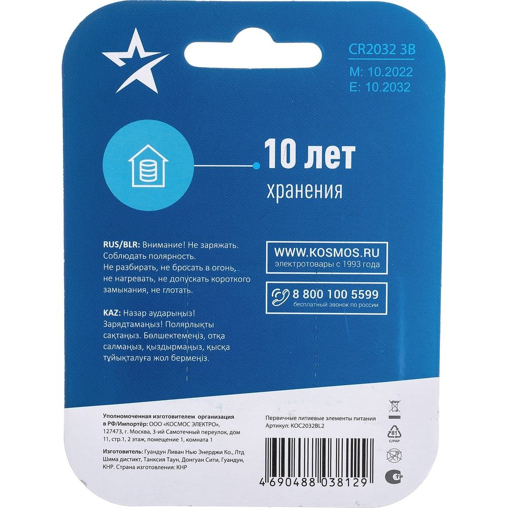 Элемент питания литиевый CR2032 2хBL (блист.2шт) КОСМОС KOC20322BL