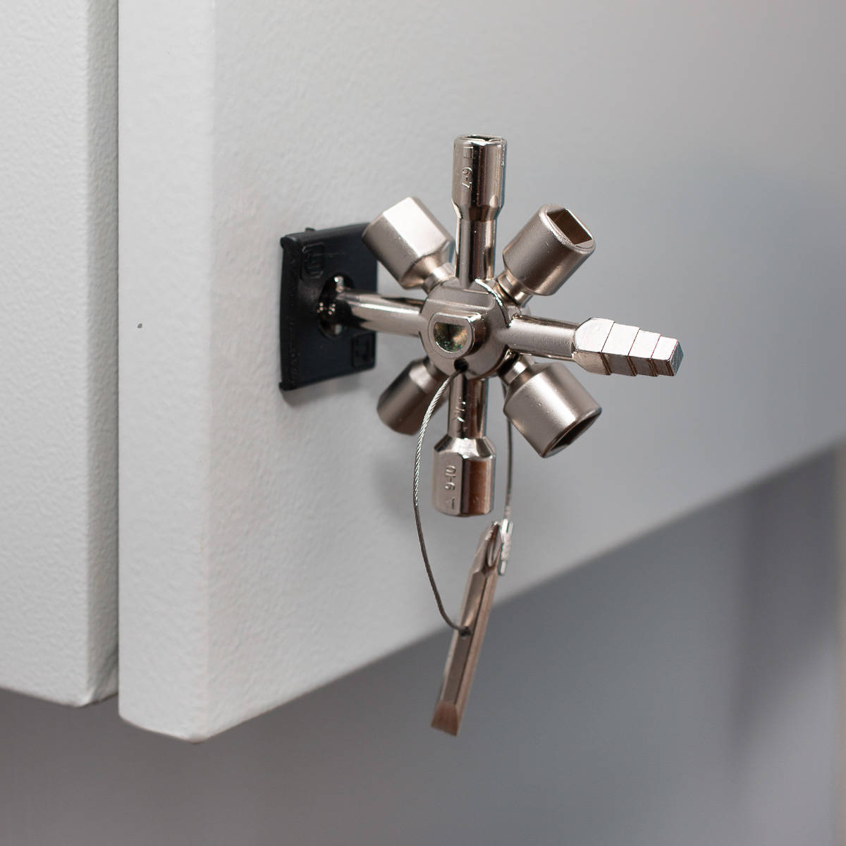 • Универсальный, многофункциональный ключ для использования в инженерных системах зданий и транспорта: сантехнических и электрических шкафах, системах вентиляции и кондиционирования воздуха • Ключ состоит из двух крестовин, соединенных между собой магнитами • Количество рабочих профилей ключа: 10 шт. • профиль 5/ 6-7/ 6-8/ 10-11 мм • профиль 7-8/ 9-10/ 11-12 мм • профиль 3–5 мм • профиль 6 мм • профиль 6–9 мм • Двусторонняя бита PH2/шлиц 7 мм прикреплена к ключу стальным тросом • Материал ключа: цинковый сплав • Вес: 143 г • Длина: 92 мм